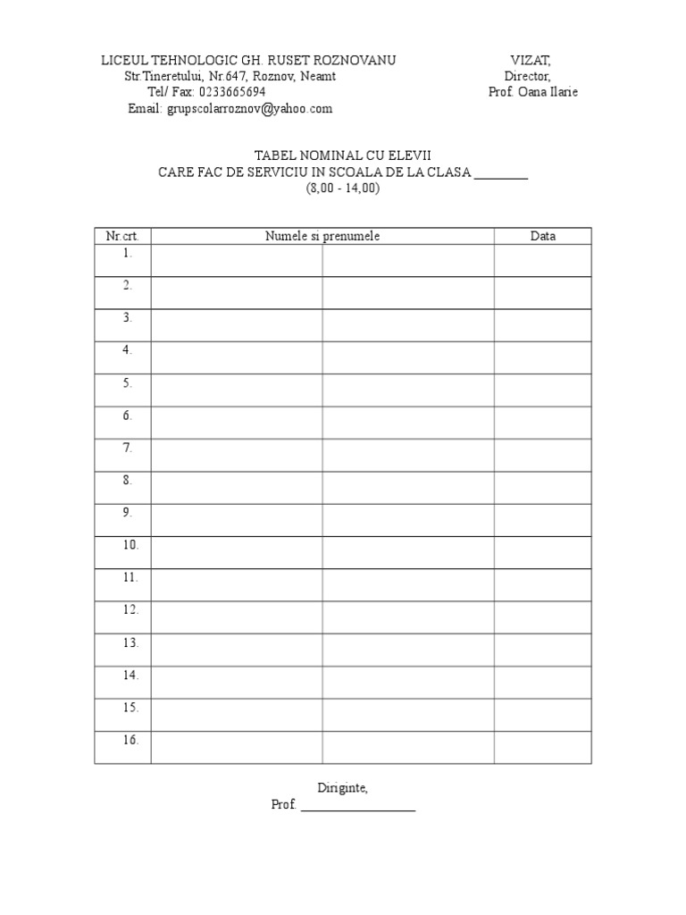 Tabel Elevi De Serviciu Pe Clasa
