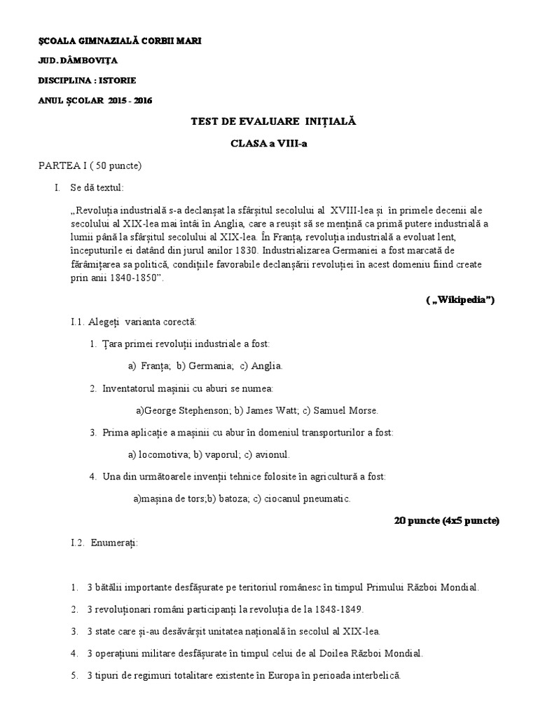 Test Initial Istorie Cls 8a