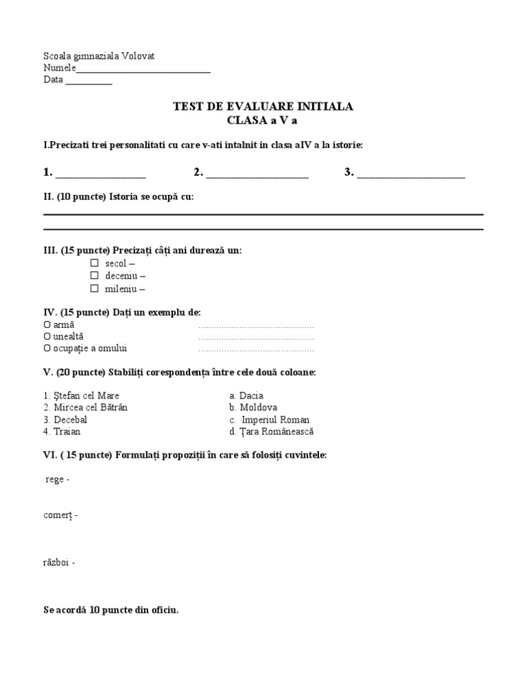 Test Evaluare Initiala Clasa A Vi A La Istorie