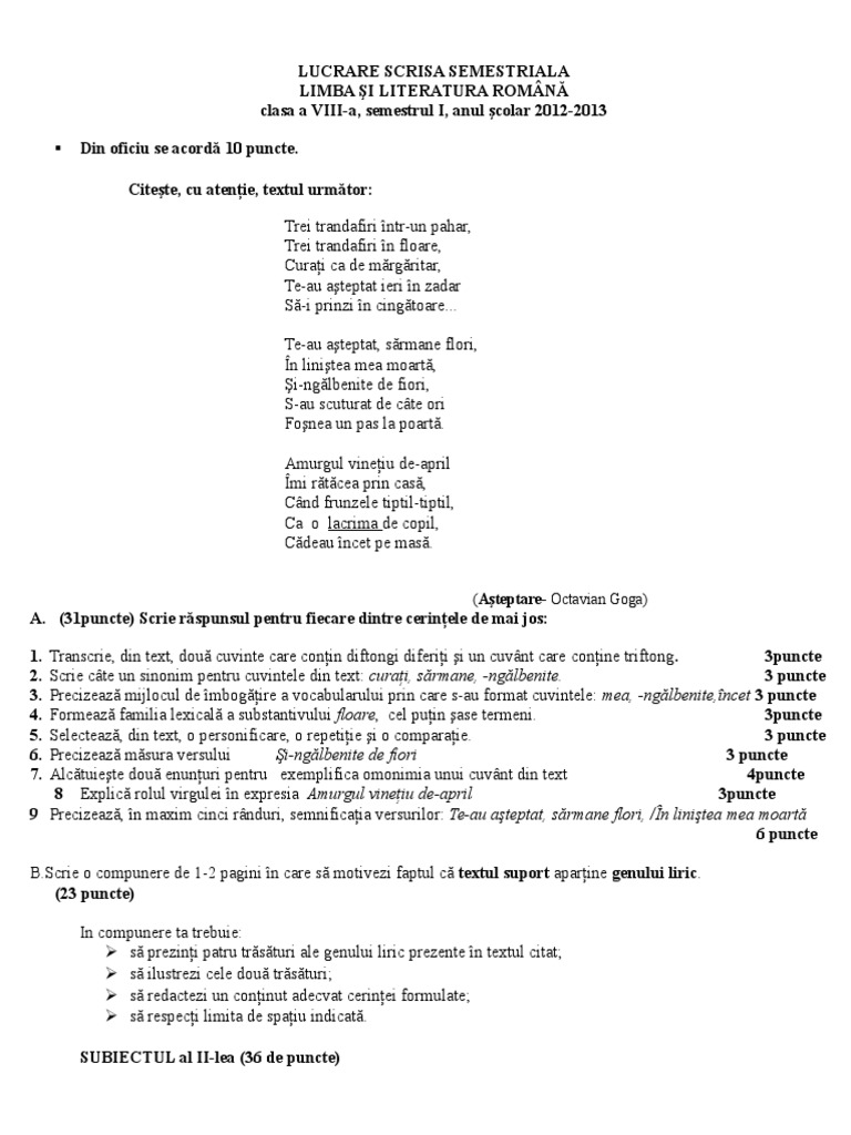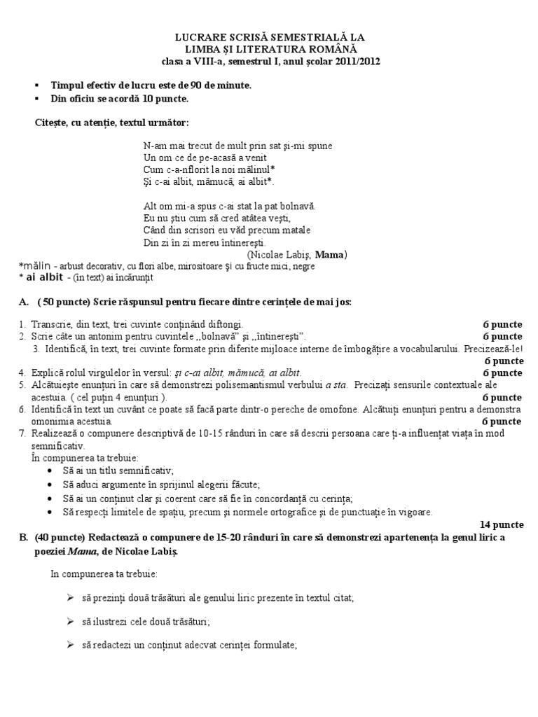Teza Limba Romana Clasa A 8 A Sem I
